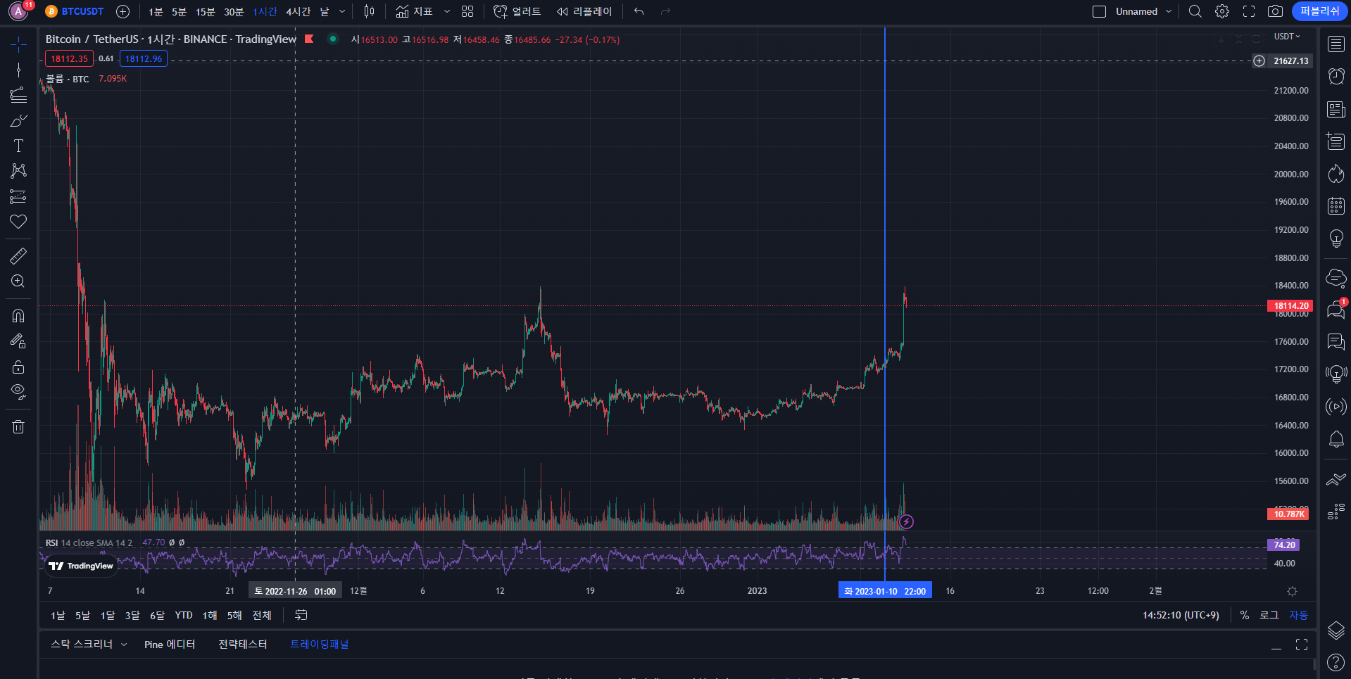 그에 따라 낮아진 거래량을 회복할 중요한 매크로 중 하나인 현지 시각 1/10 22:00 Fed 의장인 파월의 연설에 큰 관심이 몰렸습니다만, 위 차트와 같이 유의미한 움직임을 보이진 않았습니다.