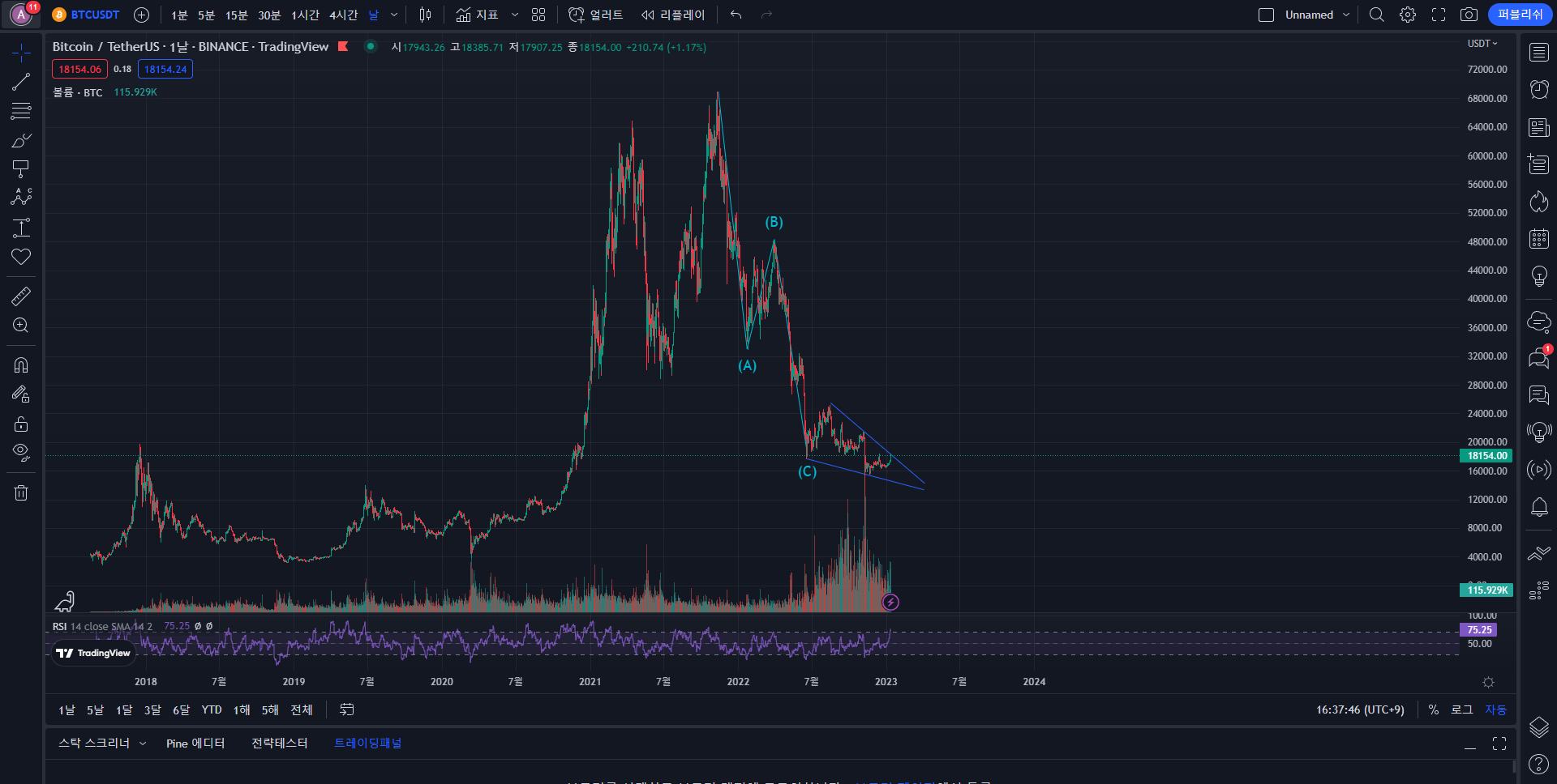 현지 기준 01/12 17:09 기준 비트코인의 차트입니다. 15.4k를 저점을 근거로 두었을 때 4시간봉 상 지금의 파동은 abc로 완성될 가능성이 큽니다. 거기에 CPI 발표 전 후로 큰 움직임이 나오는 것을 근거로 이전 매물대 구간에 머물러 있는 지금은 한 방향으로 휩쏘(whipsaw)를 줄 가능성을 염두하고 있습니다. 때문에 지금 하락을 예상하고있는 저로서는 위 방향으로의 휩쏘 후 중단기적으로 하락할 가능성을 염두하고 있습니다. 때문에 저는 윗 방향의 휩쏘가 나온다면 숏(공매도)포지션에 진입할 예정입니다.