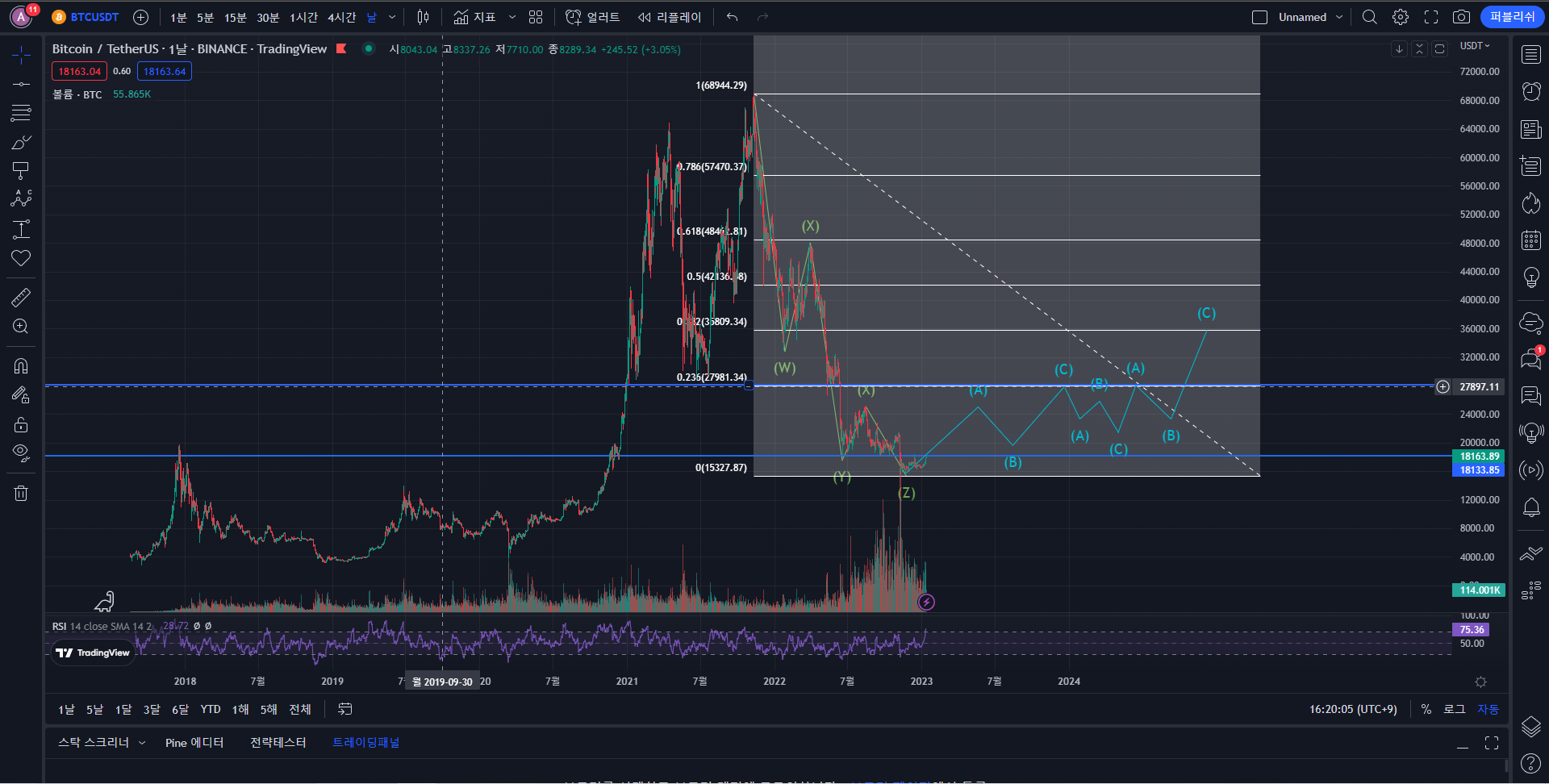 이렇게 된다면 Z파동이 끝나는 저점으로 고려할 곳이 명확하지 않습니다. 14k 매물대를 깨고 12k 가능성도 열려있으며